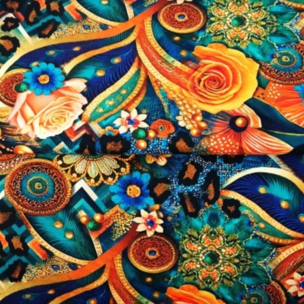 katoen-tricot digitale print ca 210/215 gram/m2 95% katoen 5% elastan  150 breed oeko-Tex standaard 100